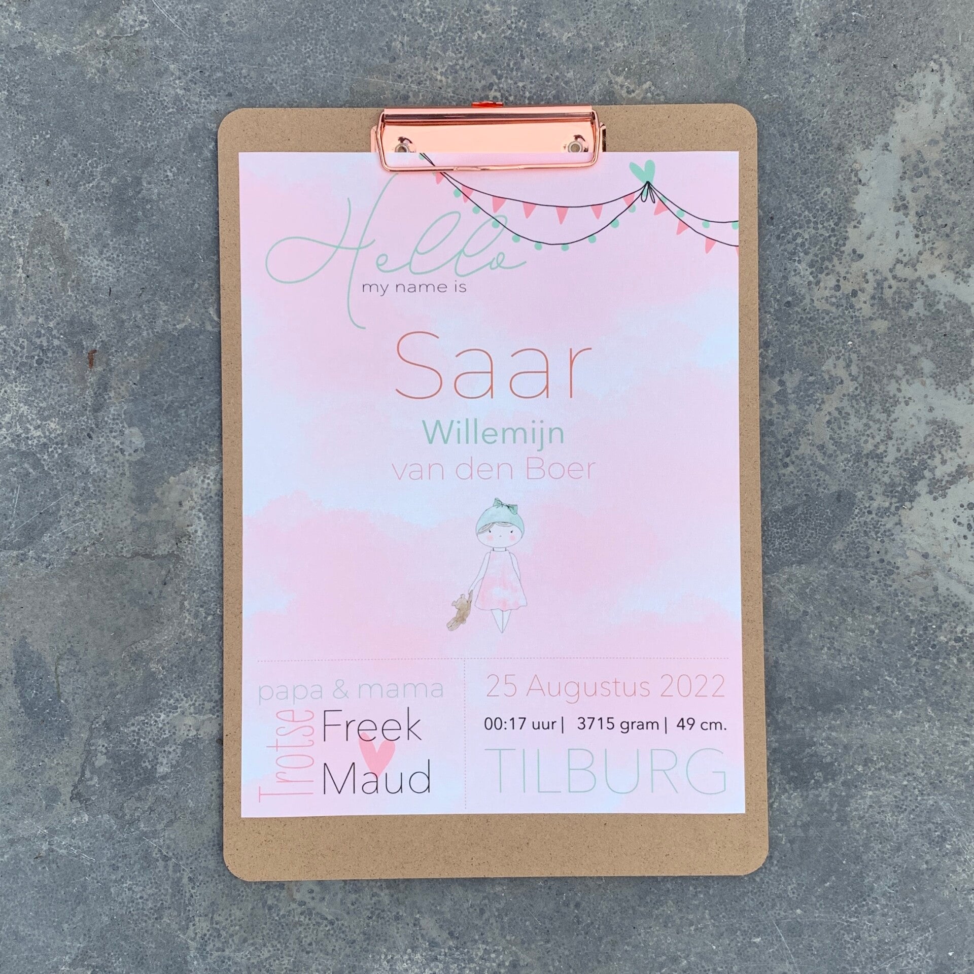 Deze poster wordt geprint op A4 formaat katoen/linnen papier en geleverd op een klembord. Je kiest zelf de kleur van de klem. Leuk om in de kinderkamer neer te zetten.