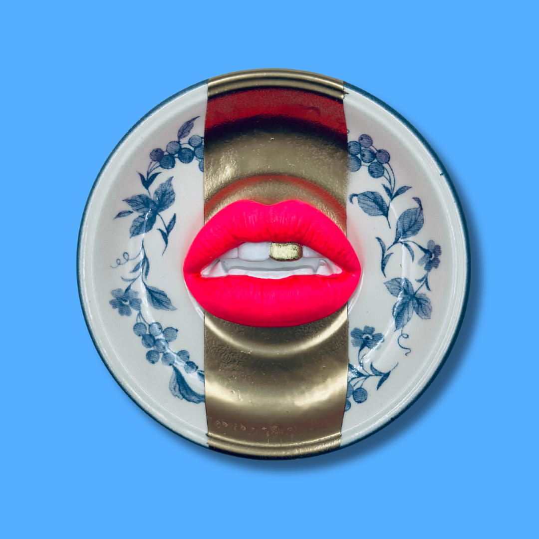 PINK hotlips op een vintage blauw/gouden bordje.