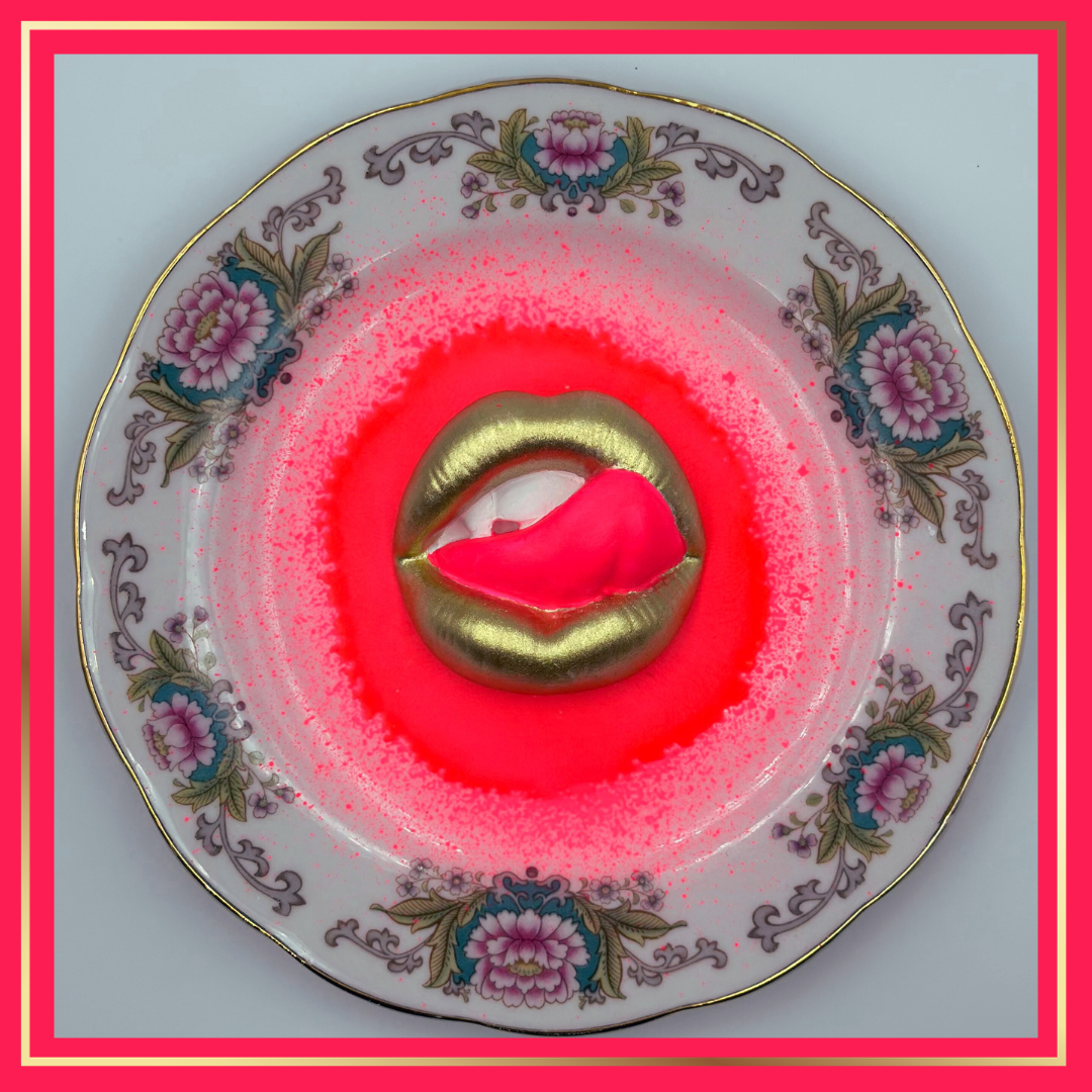 New & Vintage bloemenbordje met de ondeugende GOLDEN Lips.