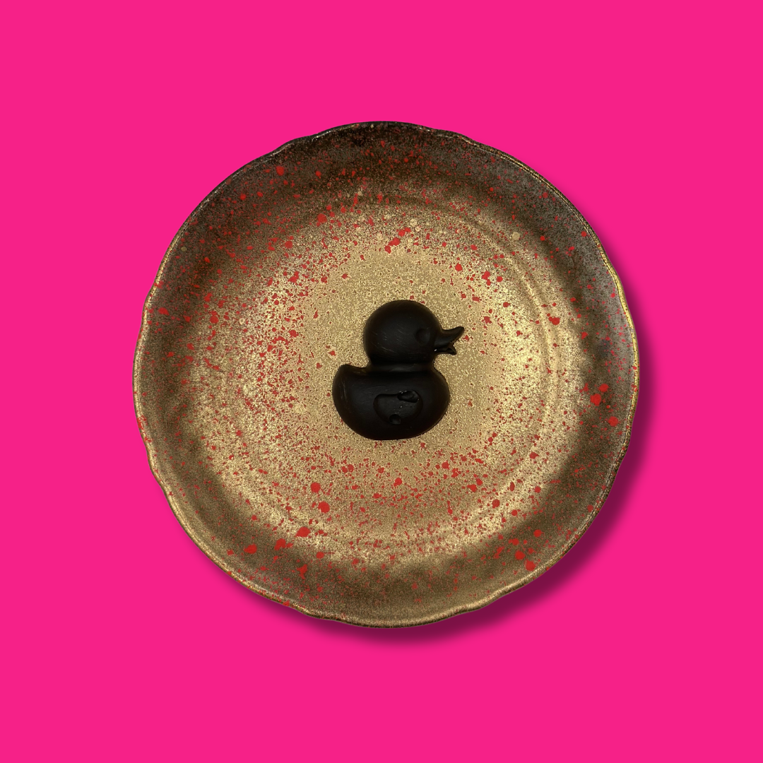 Kijk hem dan dit schattige Black Duck-ie op een goud met pink spetters bewerkt bordje!