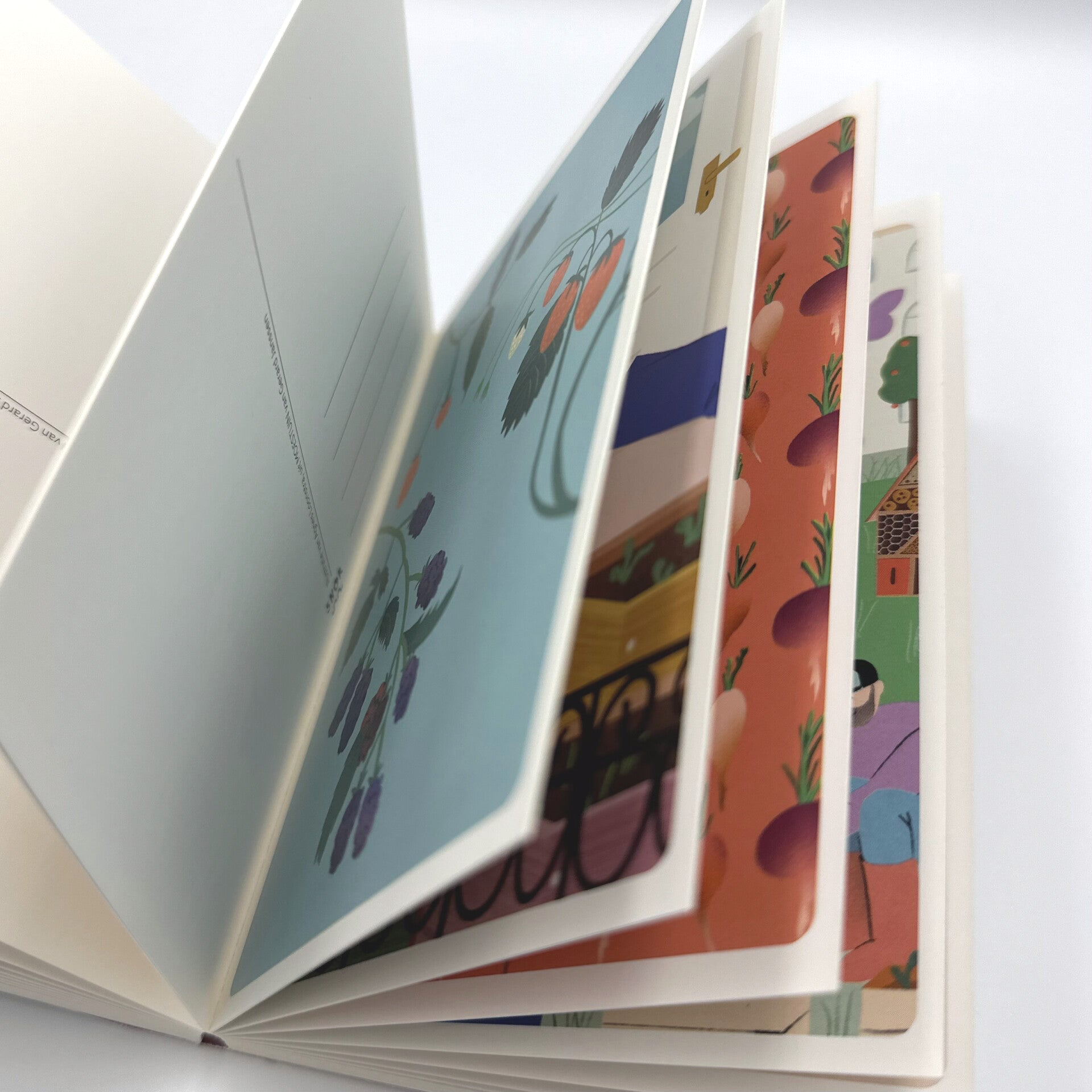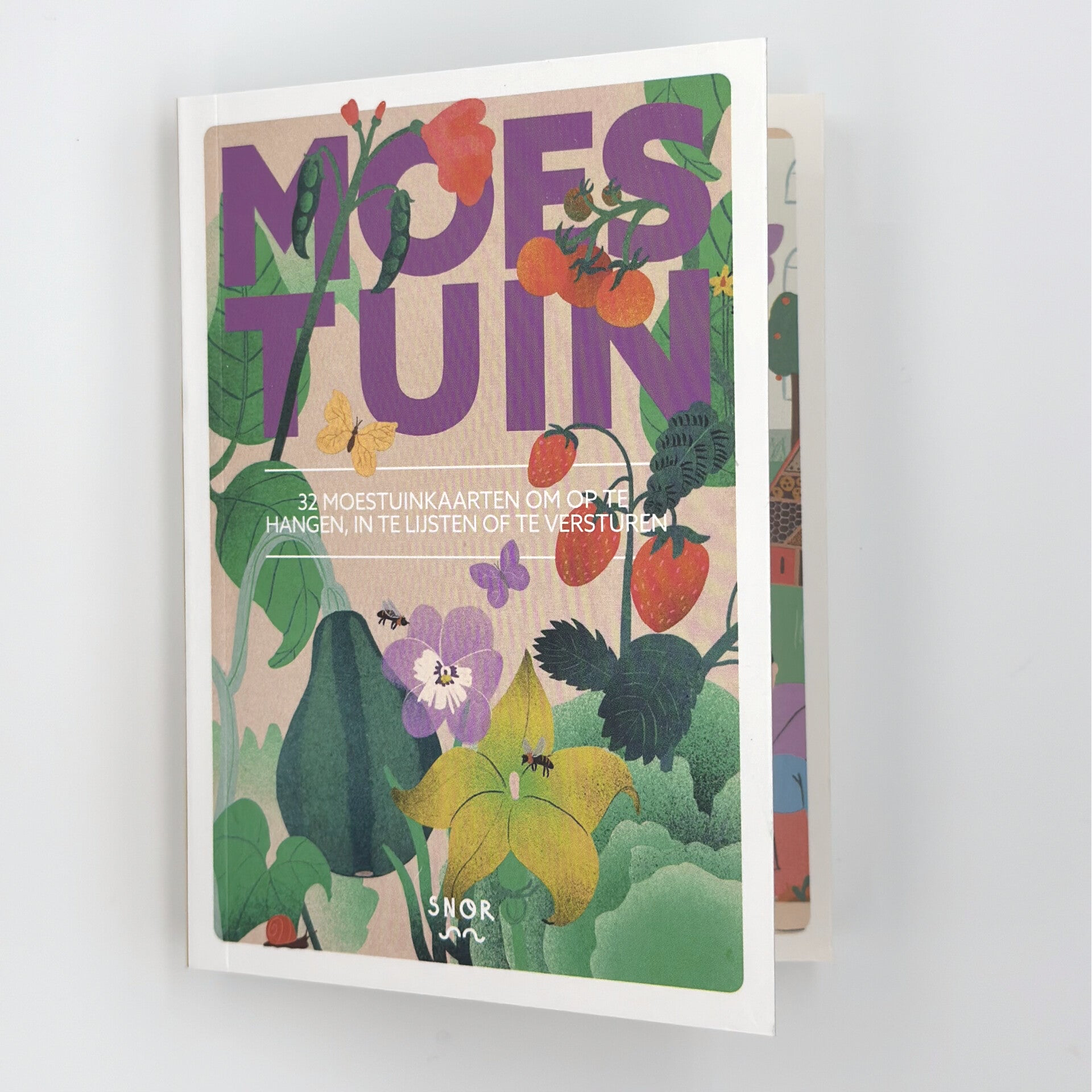 Een courgetteplant met bloemen, piepkleine aardbeitjes en een fikse tros tomaten. Met dit kaartenboekje is een mooie kaart uitzoeken een fluitje van een cent.