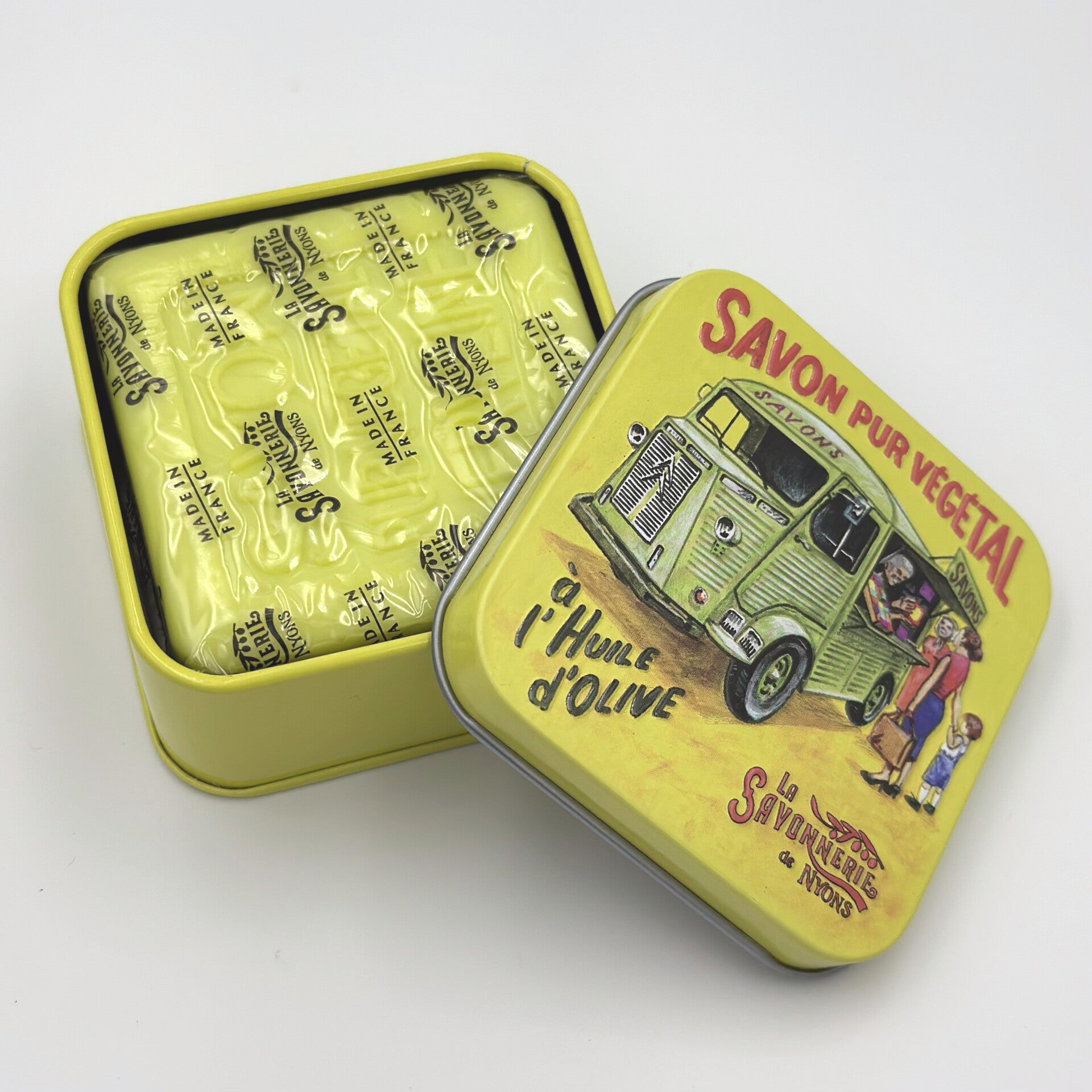 Deze zeep komt uit de Savonnerie de Nyons. In de zeep zit olijfolie uit het plaatsje Nyons, de hoofdstad van de olijven en biologische beurre de karité dat de huid verzorgt en zacht maakt. Op het blikje zeep staat een nostalgisch plaatje van een koopman op de markt in de Provence.