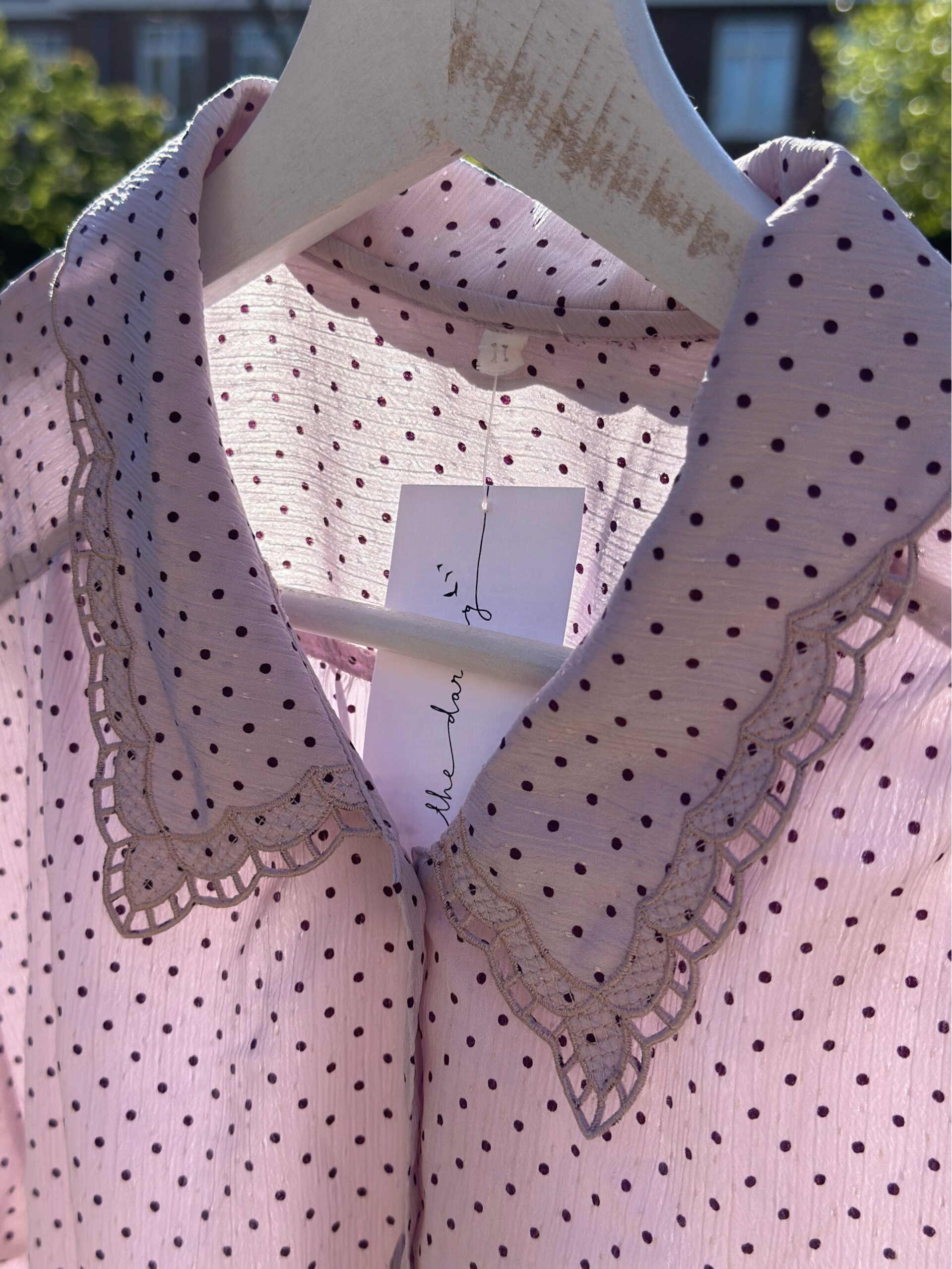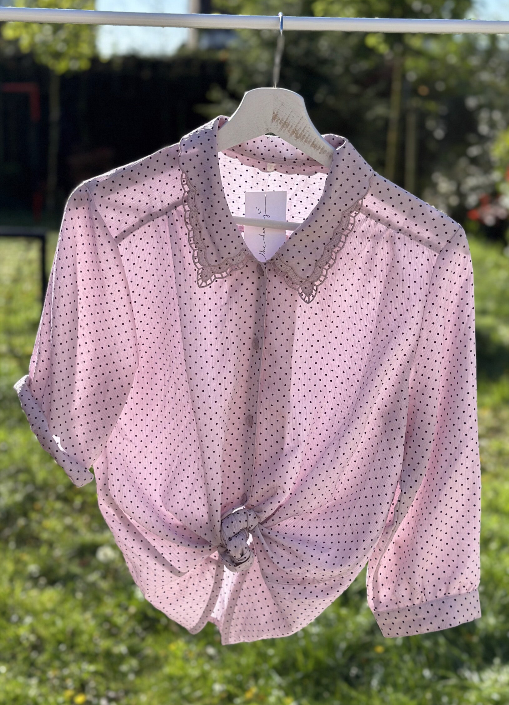 Soepelvallend schattig vintage bloesje. In een mooie pastel roze kleur met zwarte stipjes. Als leuk detail heeft dit bloesje een kanten randje langs de kraag.