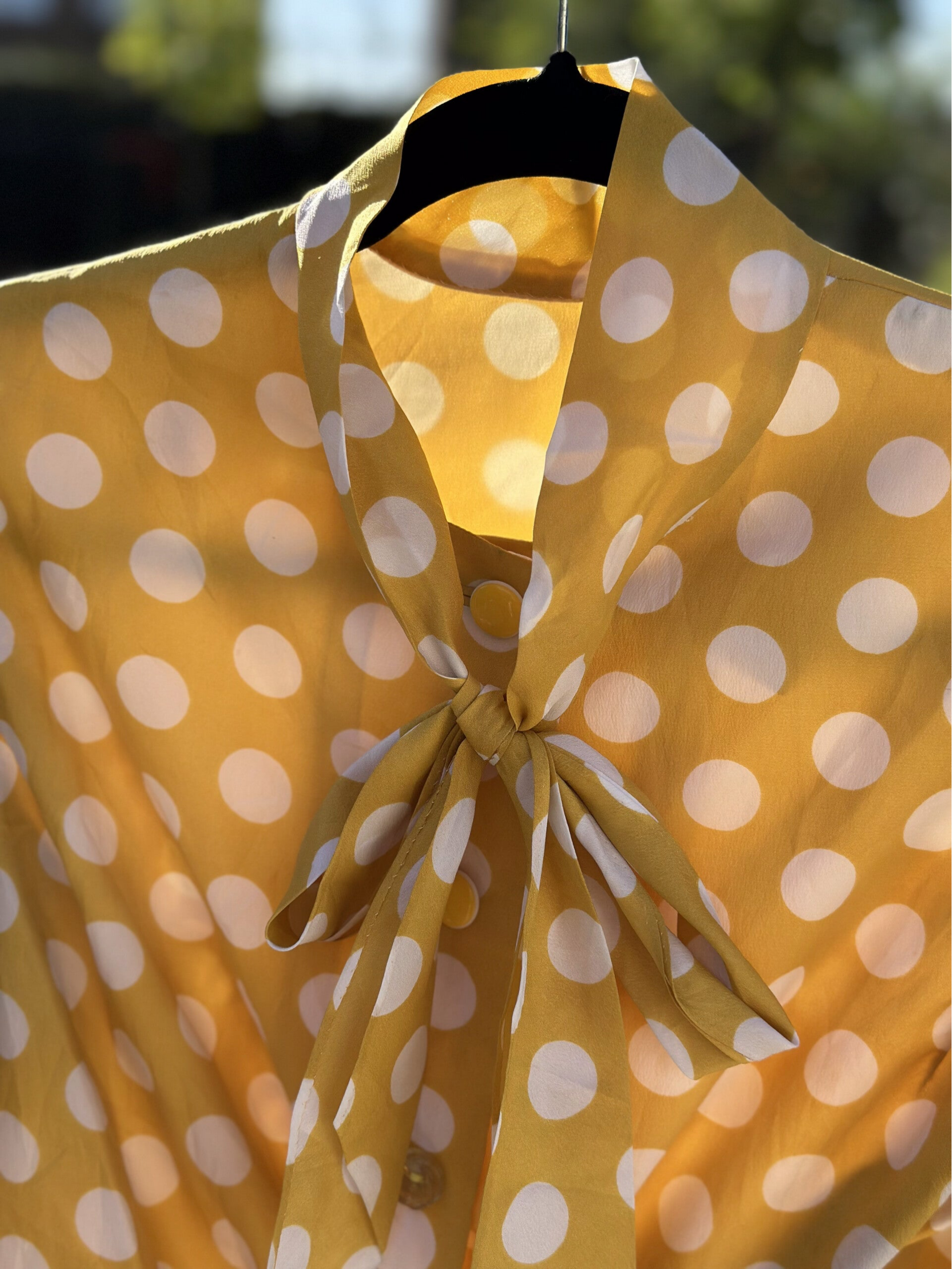 Vintage geel bloesje met witte stippen. Als leuk detail heeft het een sjaalkraag. Dit bloesje is een wat korter model en heeft een lange mouw. Wat je ook leuk kunt oprollen.