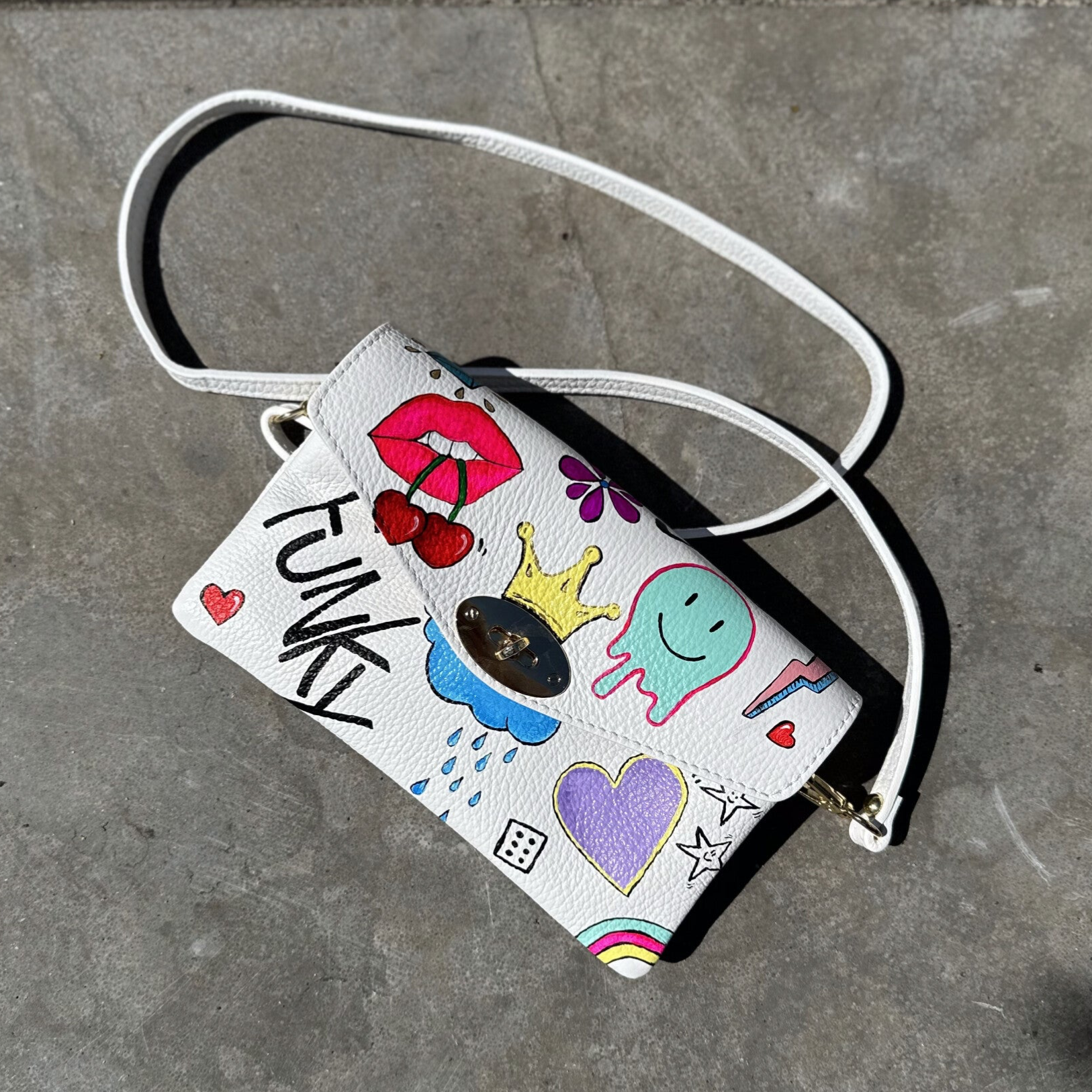 BAM!! Deze is echt Te Gek ;) al zeg ik het zelf! Een vintage wit lederen tasje voorzien met POP-ART doodles. Zit een lang hengsel aan zodat je hem ook gekruisd of over de schouder kunt dragen.