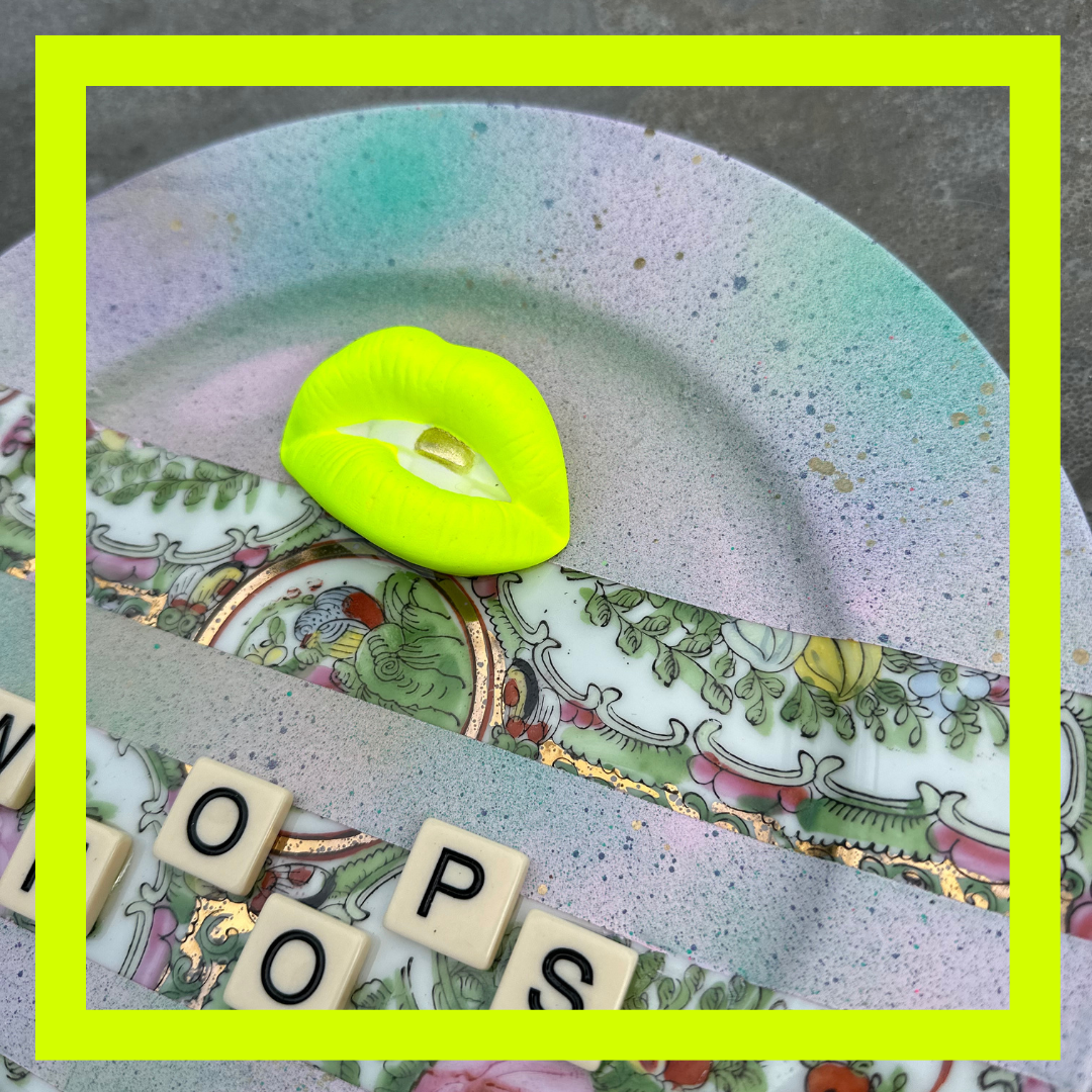 Prachtig vintage bordje bewerkt met goud en een knal roze kus mondje.