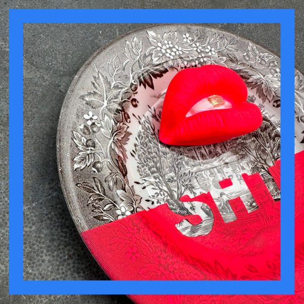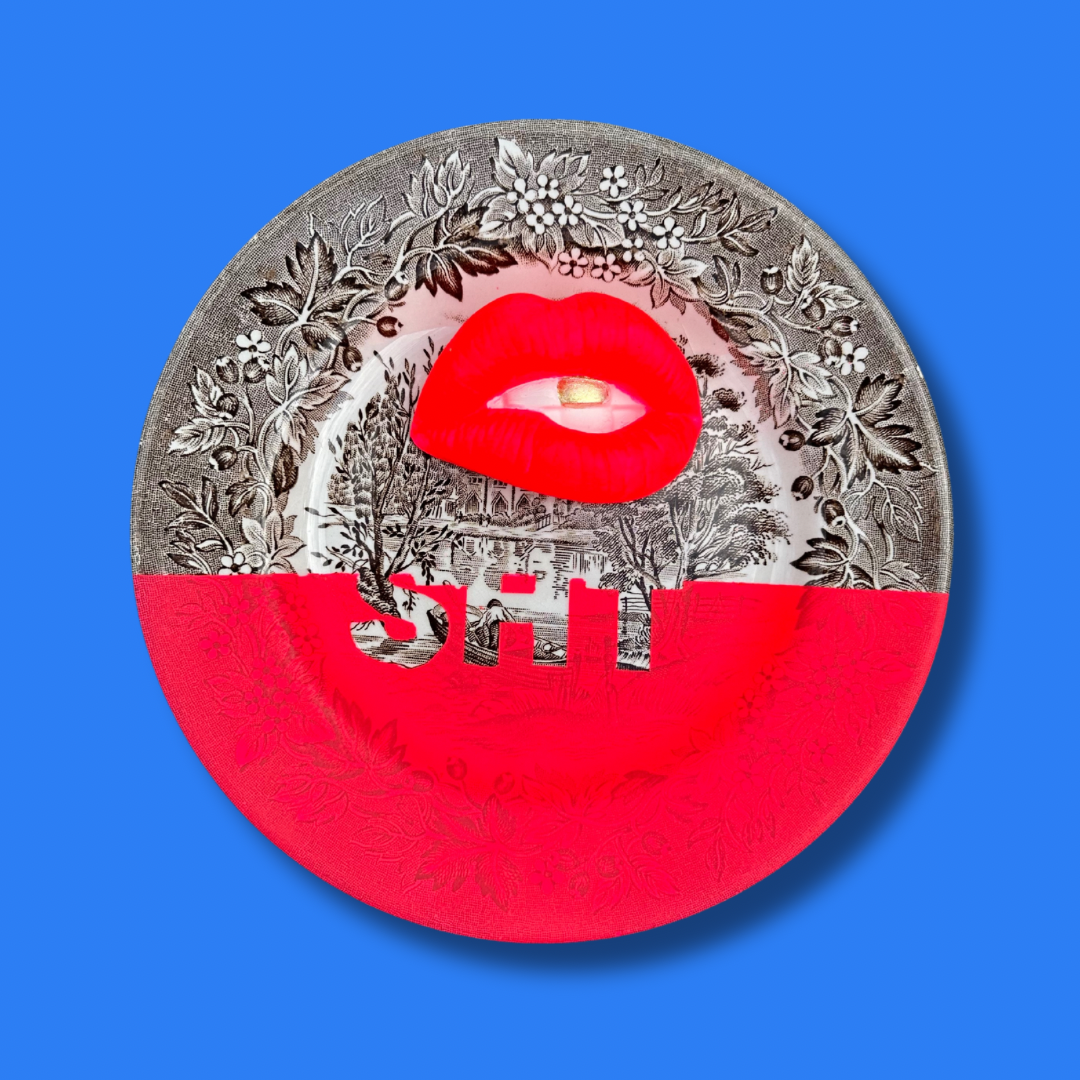 Prachtig antiek bruin/beige bordje met Neon Roze vlak en lips! En natuurlijk het leuke goude tandje als deatil.