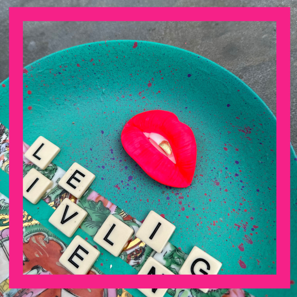 Super gaaf diep bord met een prachtige print. Helemaal gerestyled met mint, letters "lieveling" en neon pink hot lips.