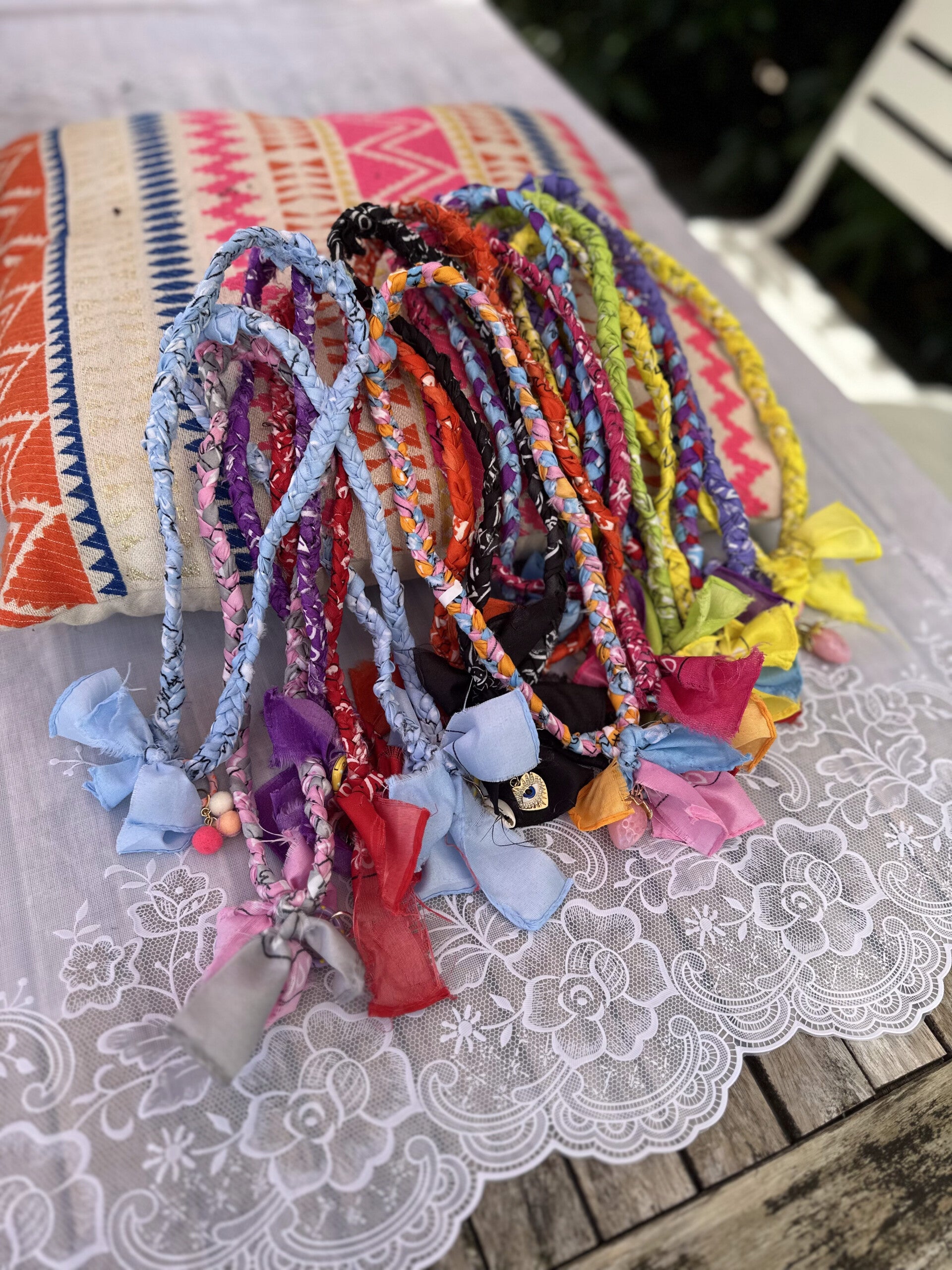 Toffe lange gevlochten bandana ketting met een schelpje hanger eraan. Deze is bevestigd met een ronde licht blauwe ring die je open kunt klikken en evt een andere hanger eraan kunt hangen. Of je haalt de hele ring eraf en draagt hem zonder hanger. De ketting kun je over het hoofd aan doen.