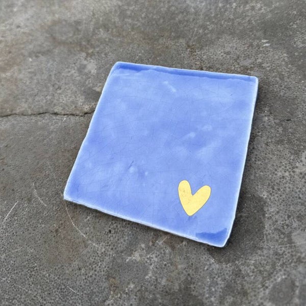 Prachtig mooi blauw keramiek tegeltje met een gouden hart vinyl sticker.