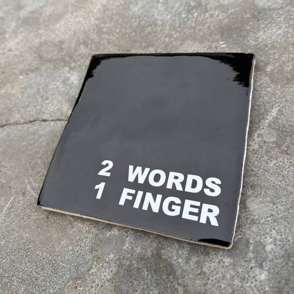 Handgevormd tegeltje van keramiek in zwart met witte vinyl tekst sticker.