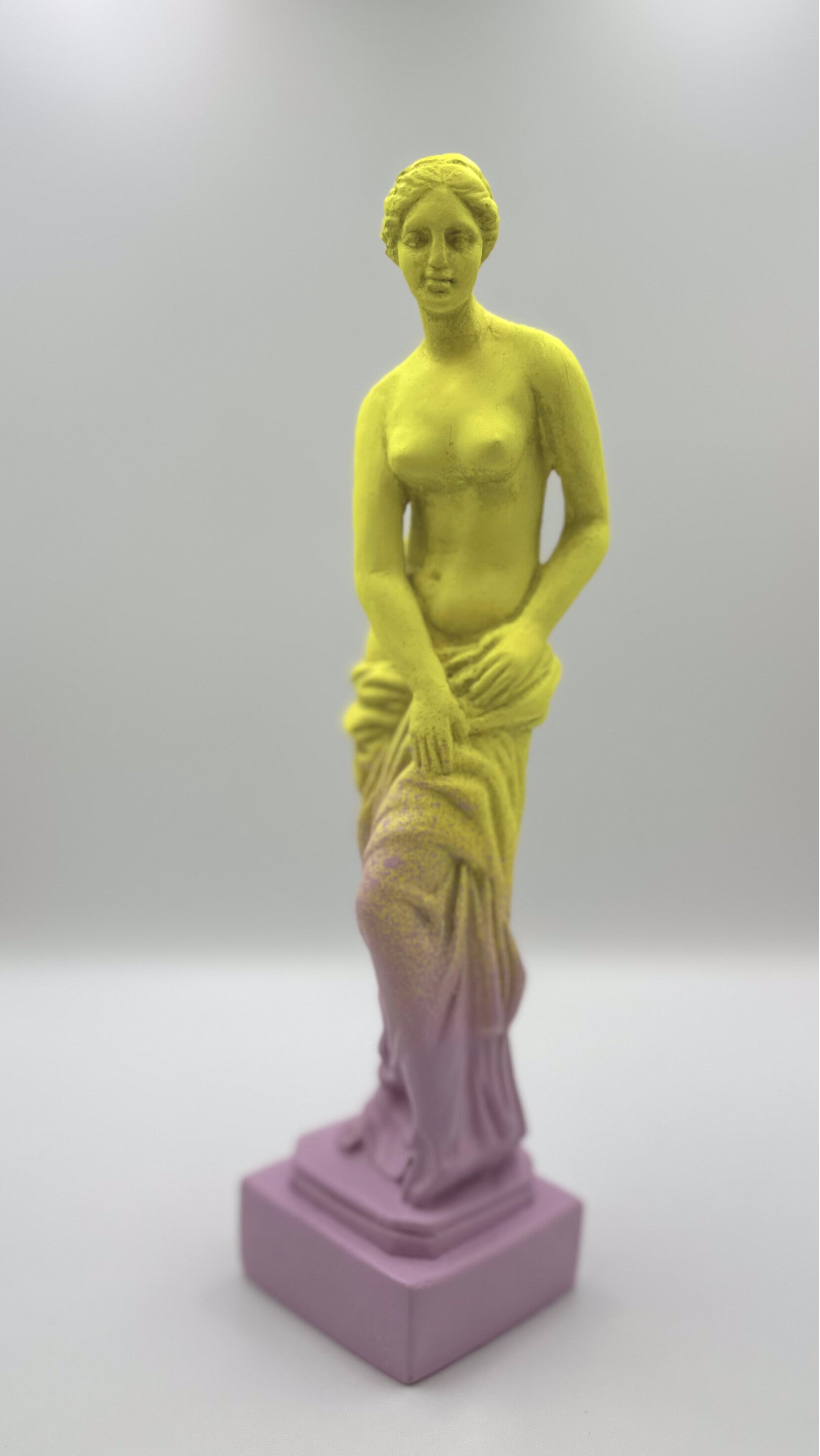 Vintage Aphrodite beeldje in Funky kleuren Neon Yellow met lila. Achterop heb ik met de hand Fuck this Shit geschreven. Daarna is ze gecoat zodat de letters er goed op blijven zitten en het wat minder kwetsbaar wordt.