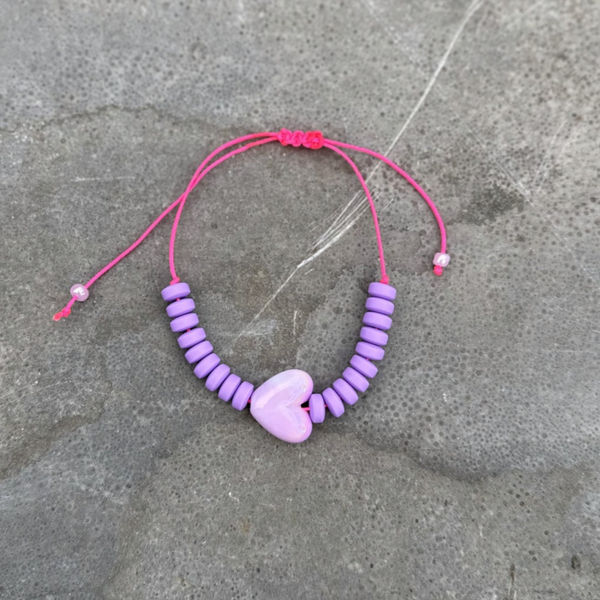 Mooie lila platte siliconen kraaltjes & een Lila parelmoer hart in het midden. Geregen aan een nylon koord en verstelbaar d.m.v. schuifknoop.