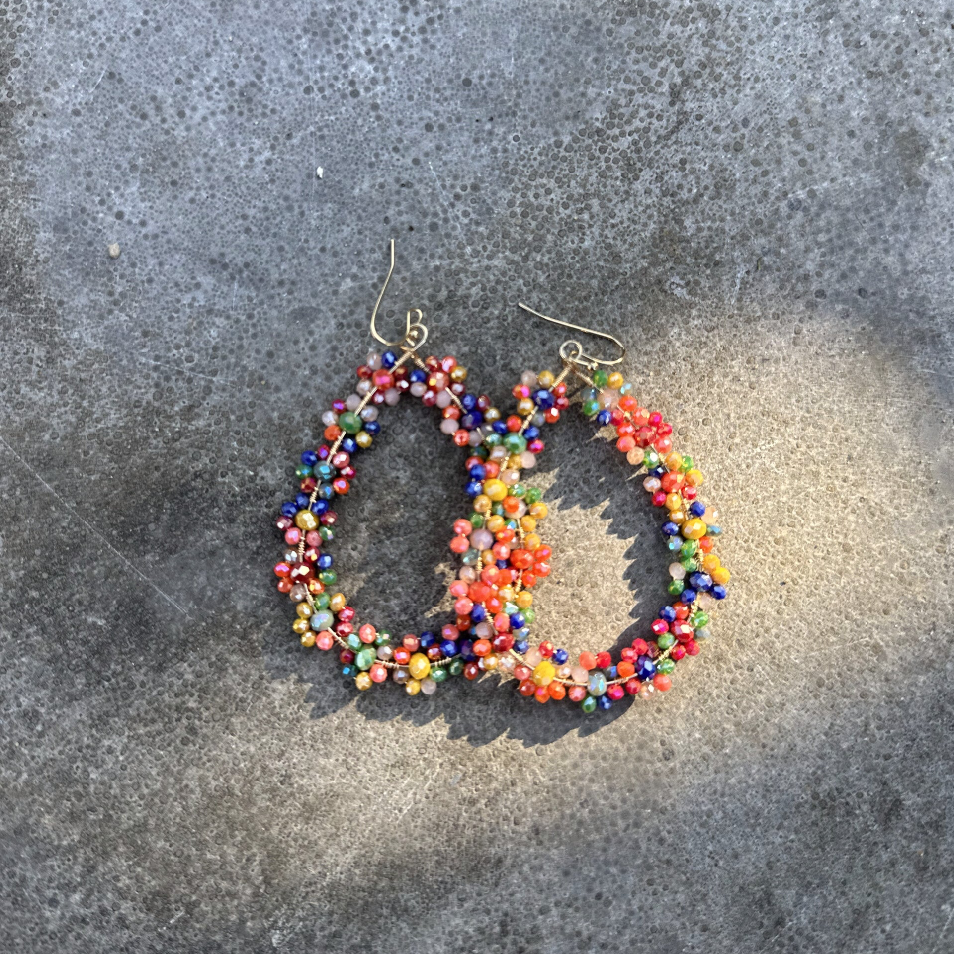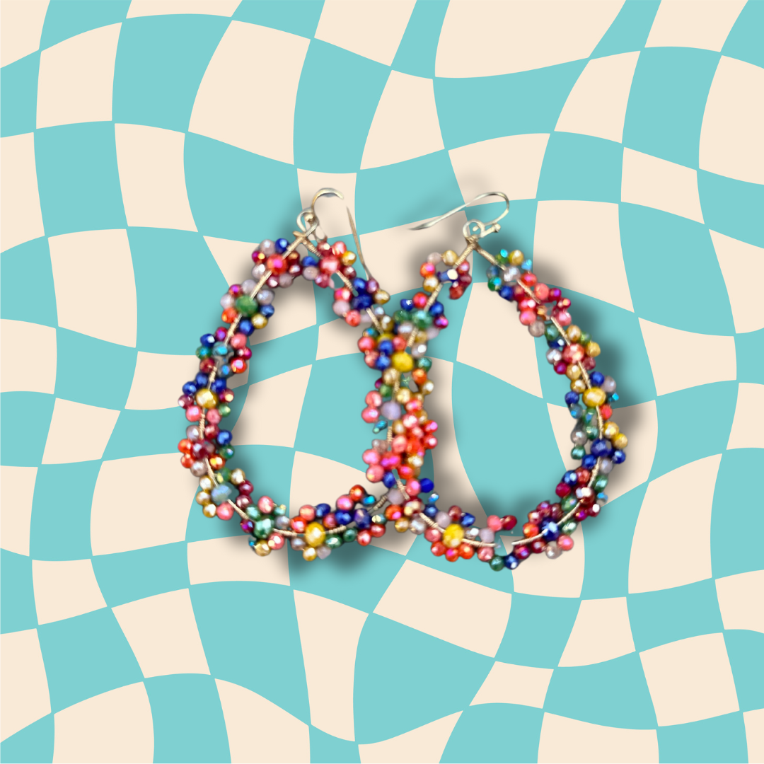 Prachtige kralen oorbellen. Druppelmodel met goudkleurig haakje. In vrolijke mix van kleur met parelmoer glans!